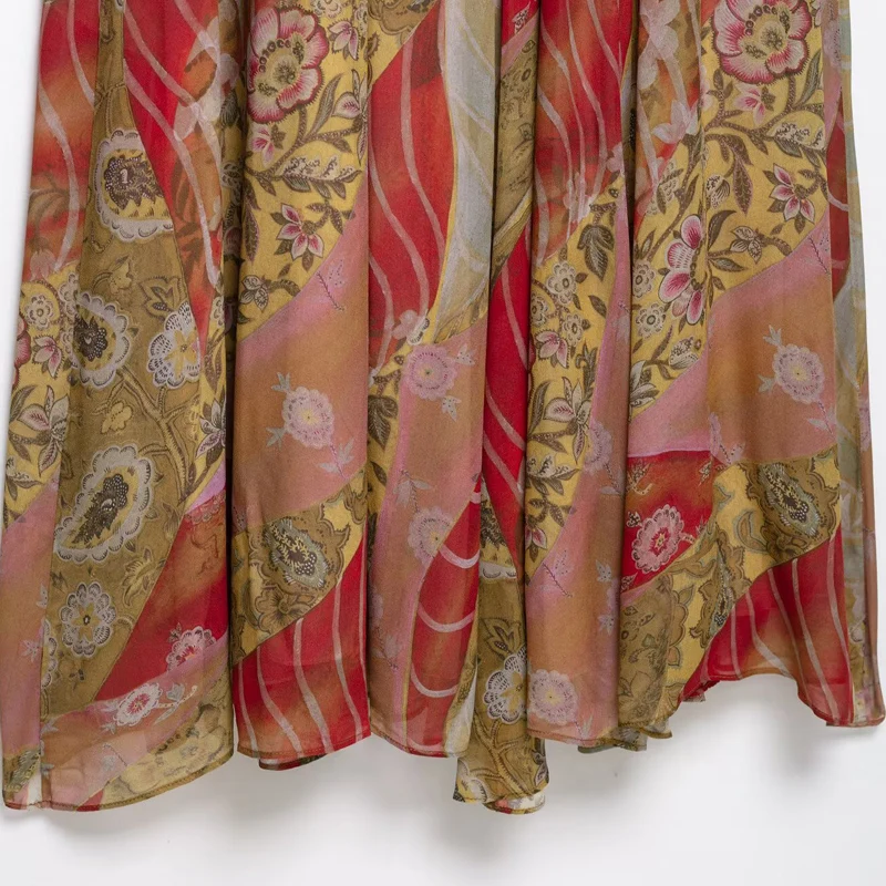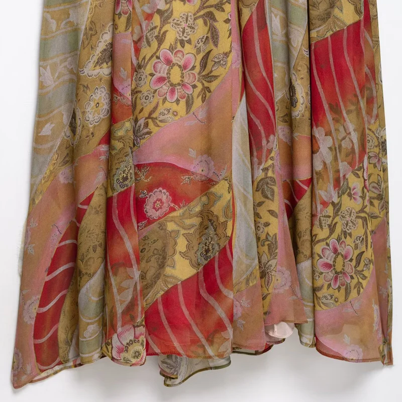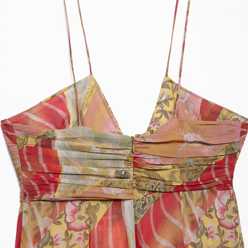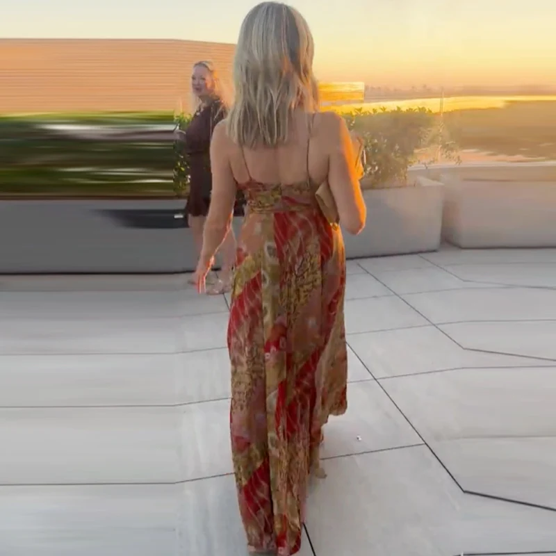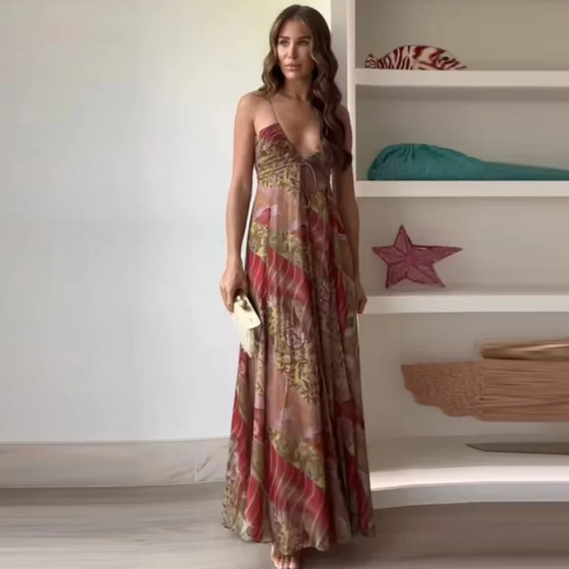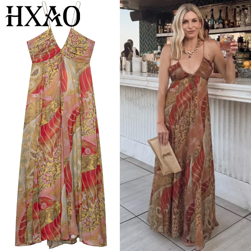 HXAO Womens Dresses Print Slip Dress Summer 2025 Elegant Party Dresses Midi Floral Ruffled Lace-Up V-Neck Backless Chic Vestidos